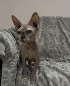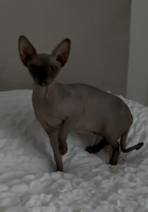 Mon coup de coeur, ma première sphynxette, noire aux yeux verts.